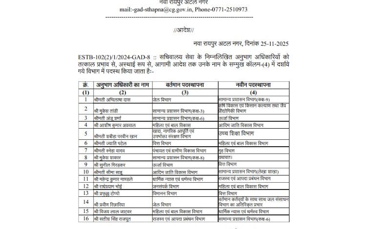 रायपुर। छत्तीसगढ़ में बड़ा प्रशासनिक फेरबदल किया गया है। सामान्य प्रशासन विभाग की ओर से जारी अधिसूचना के अनुसार, राज्य के 16 अधिकारियों का तबादला किया गया है। सचिवालय सेवा के 16 अनुभाग अधिकारियों को तत्काल प्रभाव से अगले आदेश तक अलग अलग पदों पर पदस्थ किया गया है। देखें सूची..